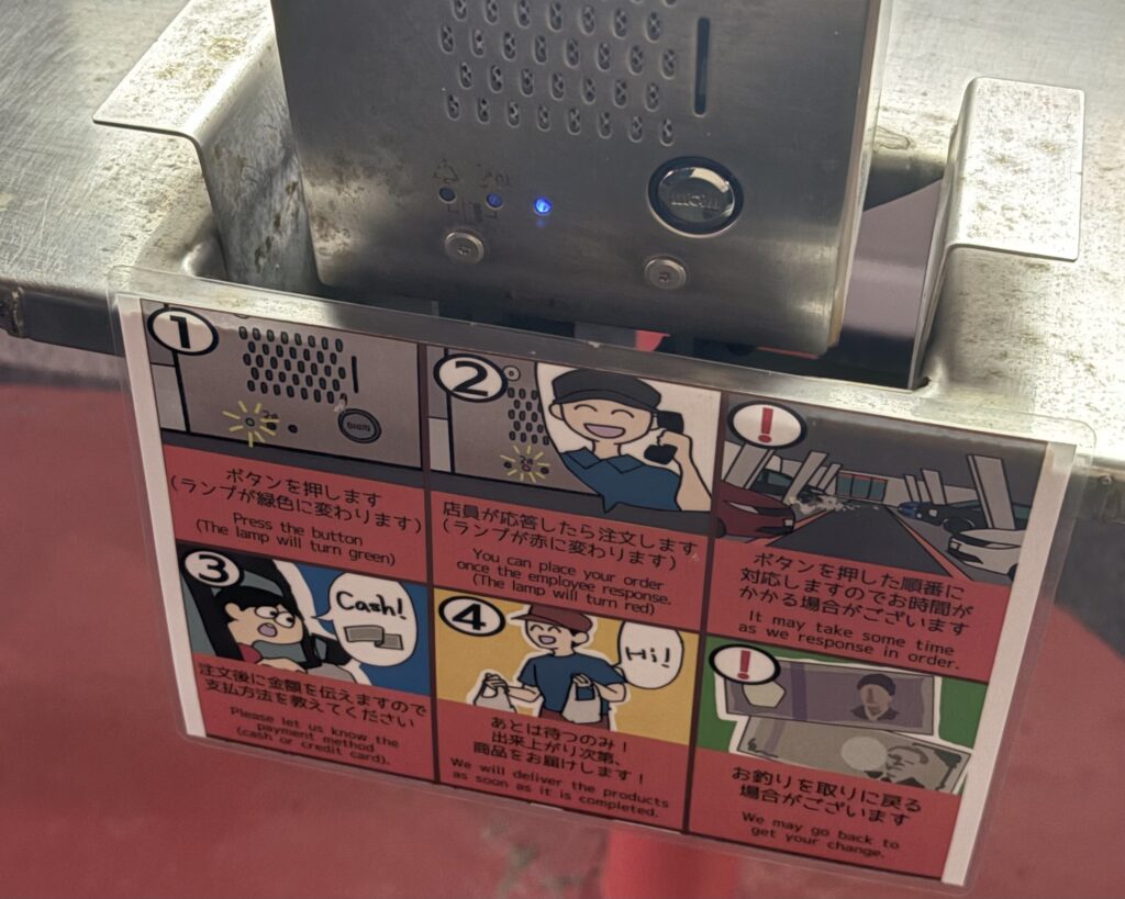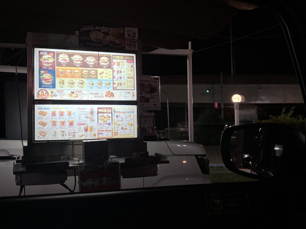 車をドライブイン専用スペースに停めて注文すると、店員が車まで持ってきてくれるのでそのまま車内で飲食できます。